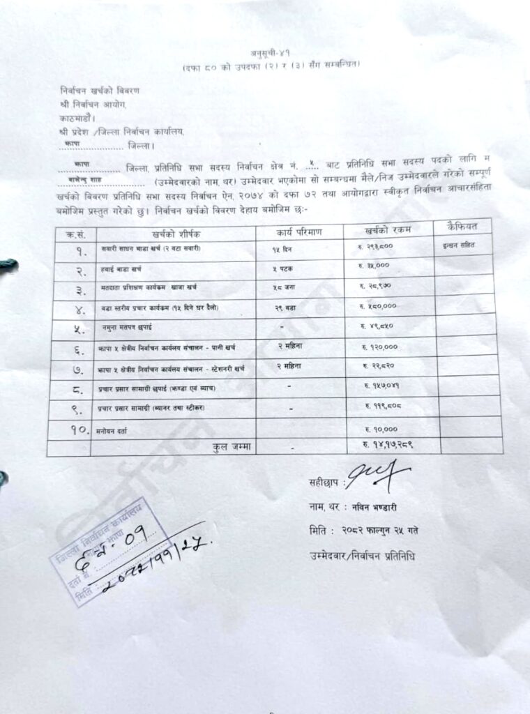 झापा क्षेत्र नम्बर ५ बाट निर्वाचित शाहका अनुसार सबैभन्दा बढी खर्च वडास्तरीय चुनावी कार्यक्रम मा भएको छ, जसमा करिब ५ लाख ८० हजार रुपैयाँ खर्च भएको छ। साथै दुई वटा सवारी साधन प्रयोगमा २ लाख ९३ हजार ८ सय रुपैयाँ, कार्यालय सञ्चालनमा १ लाख २० हजार रुपैयाँ र प्रचारप्रसार सामग्रीमा १ लाख ५७ हजार ८४ रुपैयाँ खर्च भएको उल्लेख गरिएको छ।