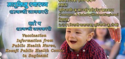 टोकियो । जापानमा जन्मिएको नवजात शिशुहरुलाई लगाउने खोप एवं स्वास्थ्य सम्बन्धि एकदिने खोप तथा मातृशिशु स्वास्थ्य सम्बन्धि सेमिनार हुनेभएको छ ।...
