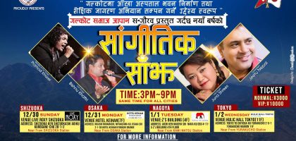 टोक्यो नोबेम्बर ३० । बिगतका बर्षहरु जस्तै गल्कोट समाज जापानले यो आगामी अग्रेजी नया बर्ष २०१९को उपलक्षमा बिशेष सांगीतिक धमाका गर्ने...